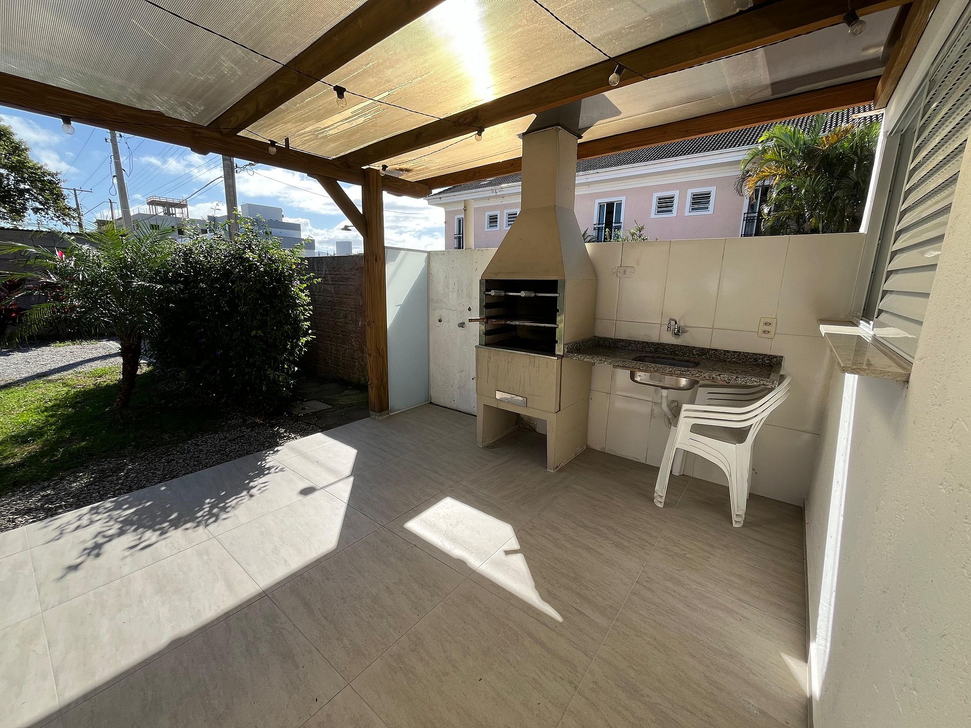 Desfrute da sala espaçosa e acolhedora com Smart TV, cozinha completa, lavadora e uma área externa com amplo jardim churrasqueira — ideal para momentos de descontração. O espaço externo proporciona contato com a natureza e uma atmosfera de paz e tranquilidade.